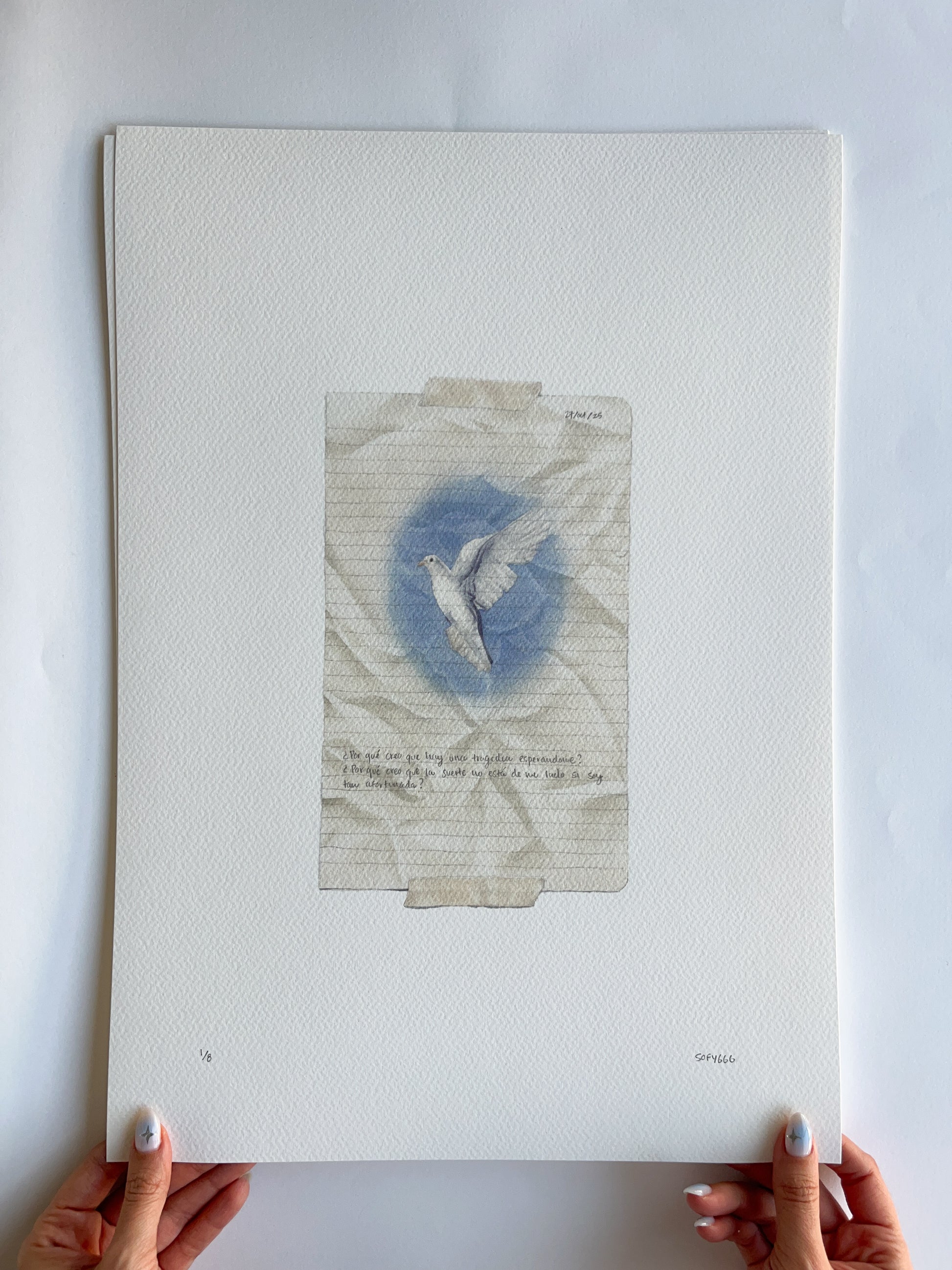 Giclée print on 100% textured cotton paper of 300gms. The paper is acid-free, lignin-free, and meets the strictest requirements for aging resistance.
